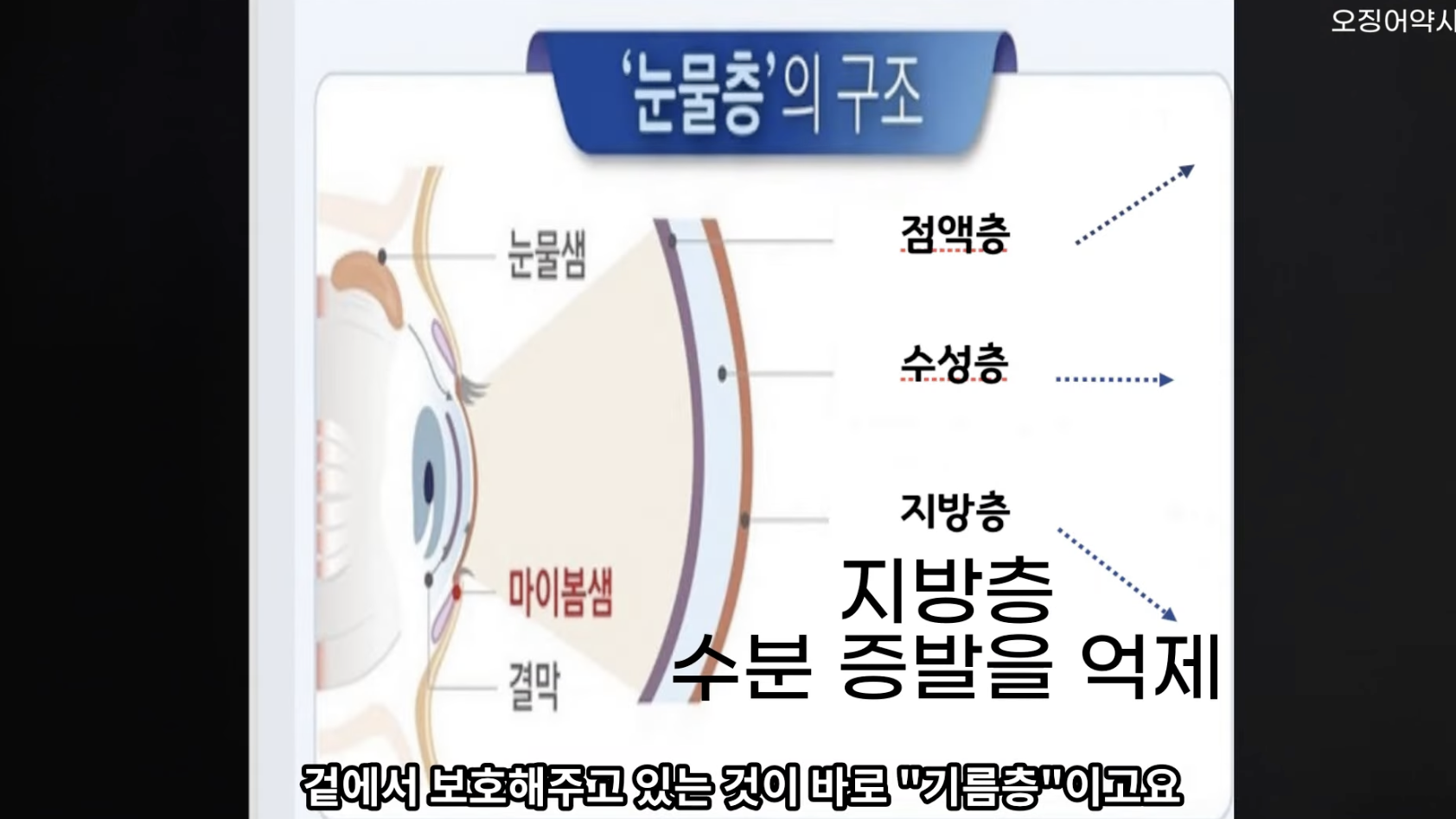 우리 눈은 공기 중에 노출되어 있기 때문에, 눈이 쉽게 건조되기 않게 해주는 것이 기름층입니다. 이러한 기름층이 분비되는 것이 "마이봄샘"입니다. 대구간유가 지방층의 원료로 쓰이고 있다는 점과 마이봄샘에서 염증이 생겨서 염증 억제를 하는 것도 대구간유 내에 있는 오메가3의 역할입니다.