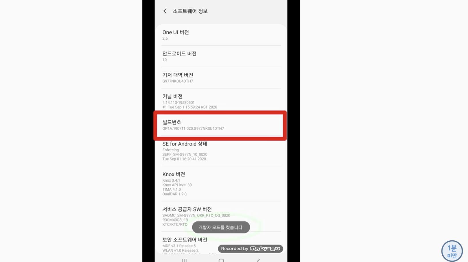 4. 소프트웨어 정보에서 "빌드번호"라는 옵션을 4~6번 터치하게 되면, 하단에 개발자 모드라고 표시가 뜹니다.