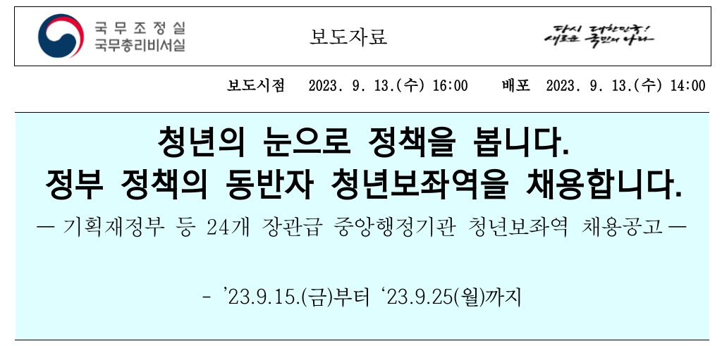 2023 청년보좌역 채용 지원자격, 신청방법, 채용인원에 대해서 한번 알아보도록 하겠습니다. 정부는 2023.9.15.(금) 채용공고를 시작으로 24개 장관급 중앙행정기관에서 청년의 목소리를 대변할 청년보좌역을 채용한다고 밝혔습니다.