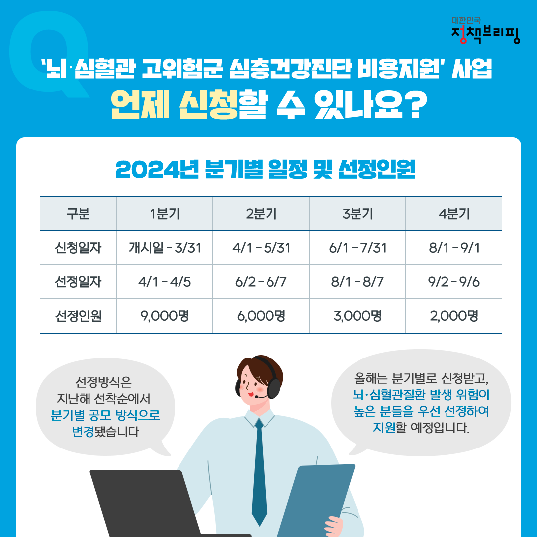 “선정방식은 지난해 선착순에서 분기별 공모 방식으로 변경됐습니다. 올해는 분기별로 신청받고, 뇌·심혈관질환 발생 위험이 높은 분들을 우선 선정하여 지원할 예정”