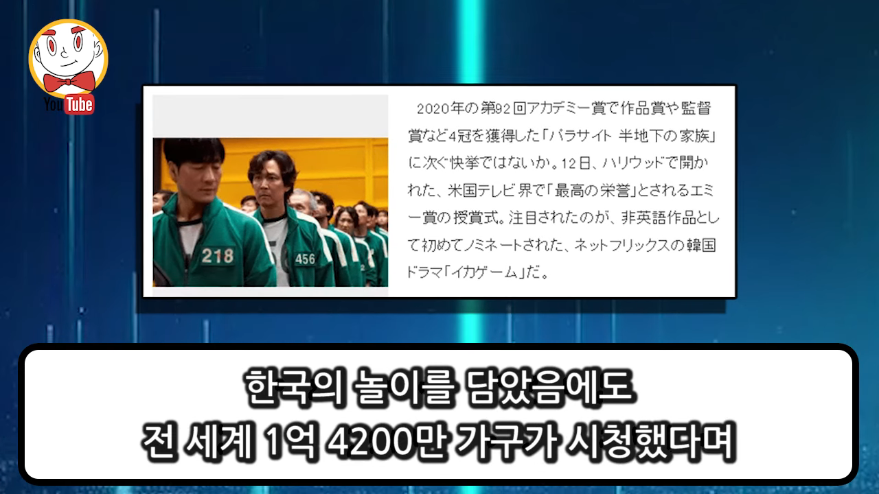 일본 주요 언론에서도 오징어 게임 수상에 대해 보도했고 한국의 놀이를 담았음에도 전 세계 1억 4천200만 가구가 시청했다며 한국 콘텐츠의 세계적인 위상이 높아졌고 현재는 그 정점에 서 있다며 오징어 게임 수상 소식에 대해 호평하는 가운데 그들의 복잡 미묘한 감정에 대해서도 표현했습니다.