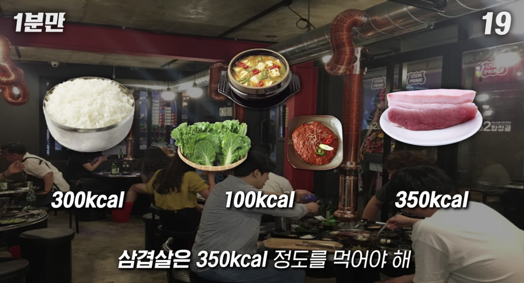식당에서 밥을 먹는다고 가정했을 때, 아래와 같이 나오게 됩니다. 식당에서 1일 권장량에 맞게 식사를 하게 될 경우, 밥 1공기 300kcal, 상추, 쌈 그리고 된장찌개 100cal 그리고 삼겹살 350kcal로 측정할 경우, 80g 전후로 구성되어 있다는 것입니다.