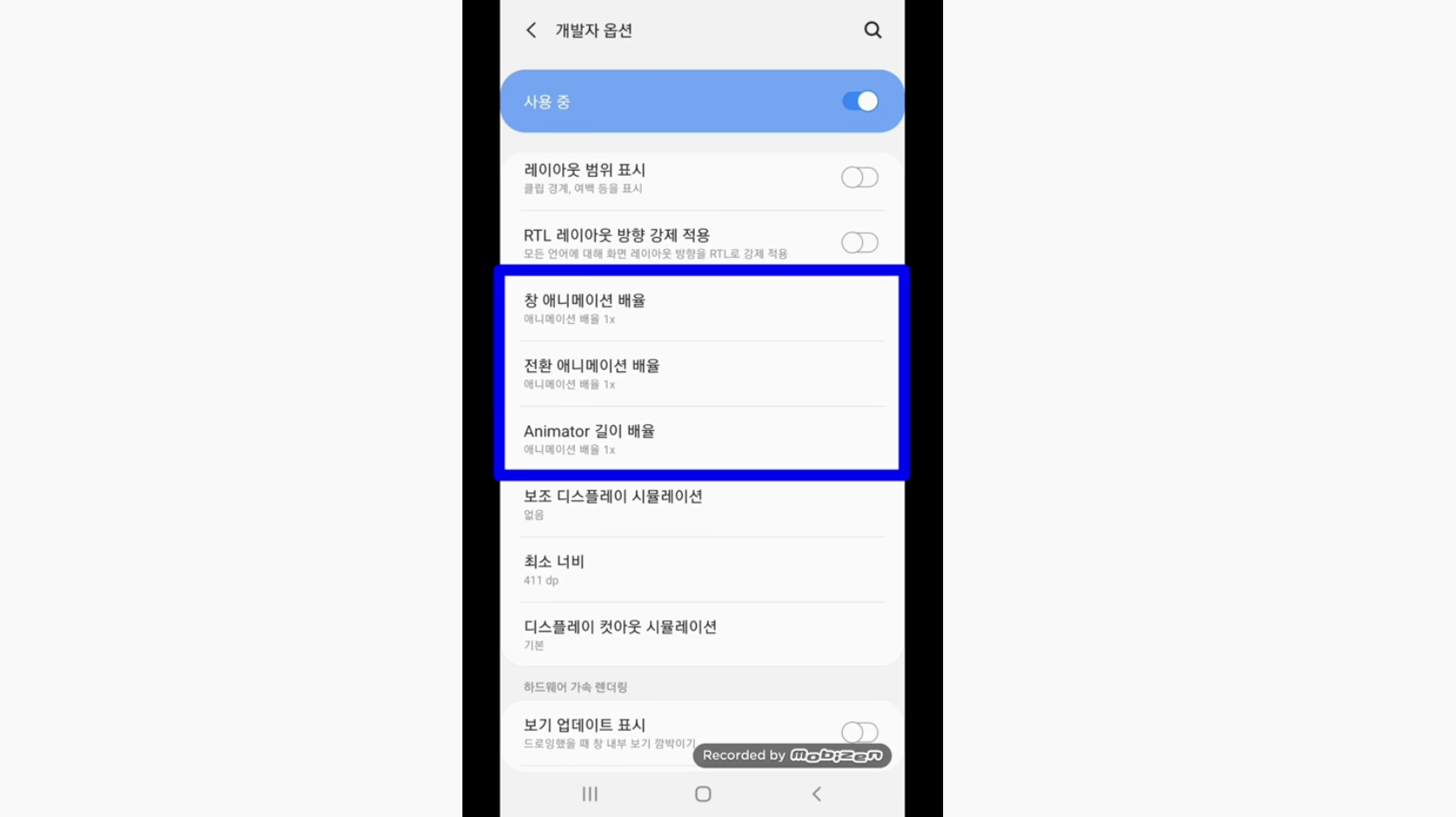 6. 개발자 옵션에서 창, 전환, 애니메이터 길이 배율이 나오게 되는데, "애니메이션 사용 안함"을 선택하면 됩니다.