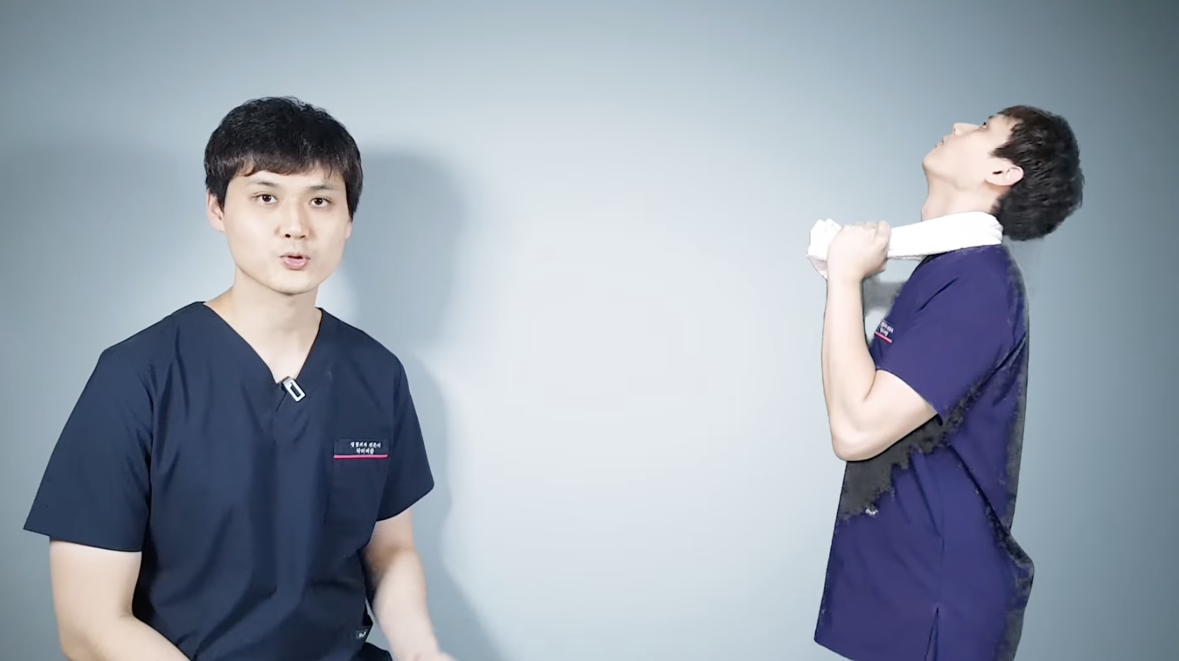 목 디스크를 예방하기 위해서는 본인이 가장 편안하게 설 수 있는 자세에서 수건 1개를 준비합니다. 사진과 같이 수건을 이용하여 수건을 목을 감아서 턱을 들고 목을 편안하게 뒤로 넘겨주면 됩니다. 다만, 이때 주의 사항은 어깨와 가슴이 최대한 펴져있는 상태로 유지해야 한다는 점입니다. 몸을 구부르게 되면, 목이 절대로 펴지지 않다는 점을 유의하고 스트레칭을 진행하시길 바랍니다.
