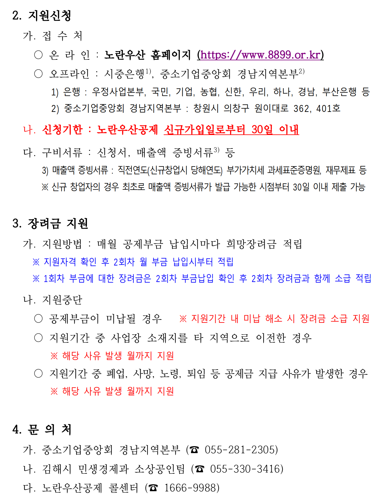 희망장려금 신청을 희망하는 소상공인은 시중은행 또는 중소기업중앙회(경남지역본부)를 방문하거나 노란우산 누리집(www.8899.or.kr)에서 노란우산공제 가입 시 함께 신청해도 되고 공제 가입일로부터 30일 이내에 신청서와 매출액 증빙서류를 제출해 신청할 수 있습니다.