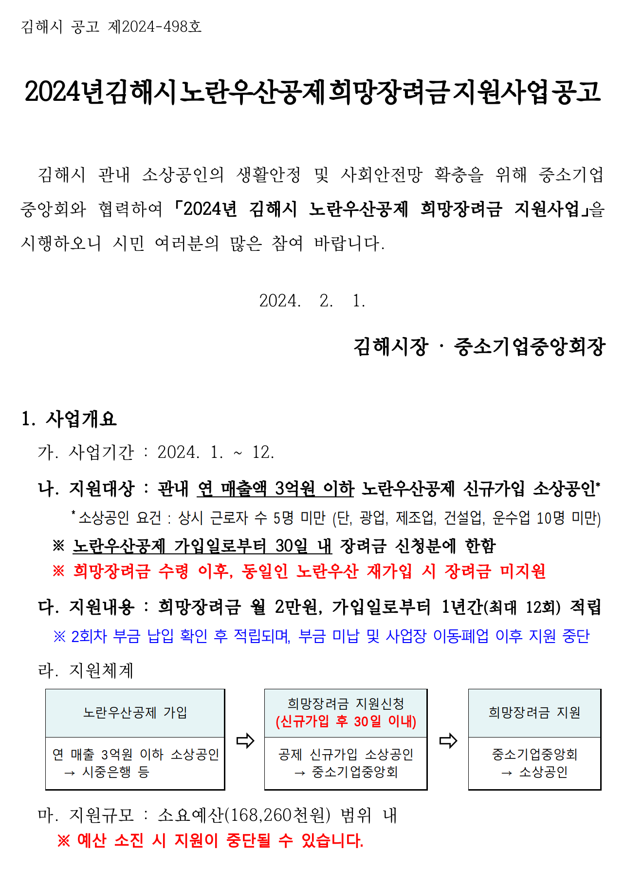 홍태용 김해시장은 소상공인의 생활 안정과 사회안전망 확충을 위해 지난해에 이어‘노란우산공제 희망장려금 지원사업’을 추진한다고 밝혔습니다.
