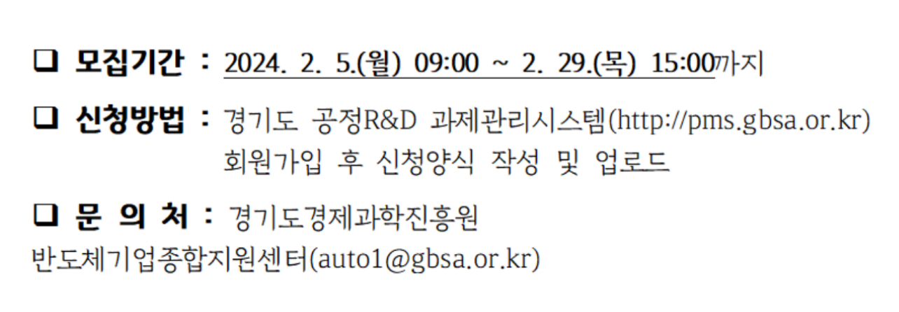 보다 자세한 사항은 공정R&D관리시스템의 모집 공고문을 참고하거나 경기도 기업육성과 소재부품산업팀(031-8030-3014) 또는 경기도경제과학진흥원 반도체기업종합지원센터(031-259-7022)를 통해 안내받을 수 있습니다.