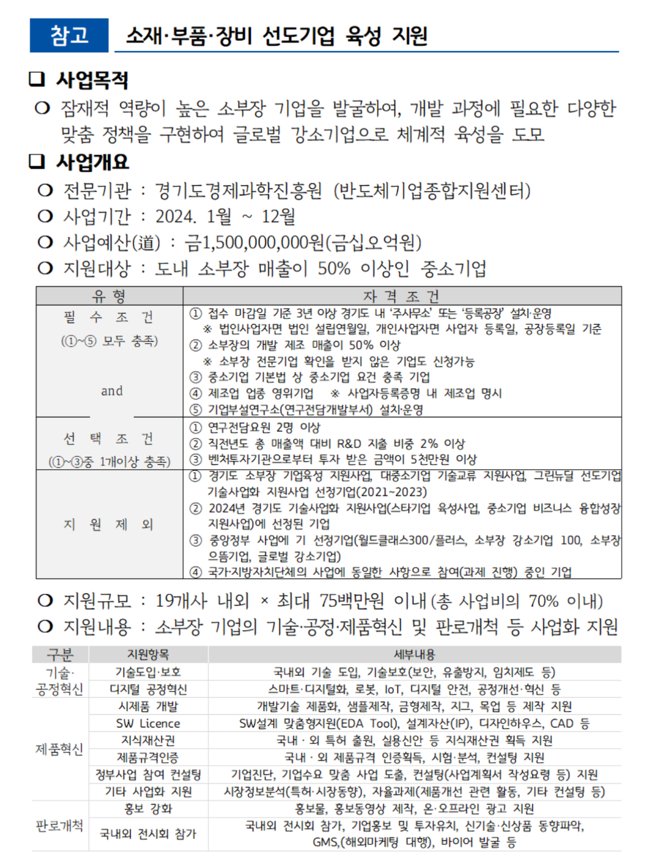 경기도는 도내 소재·부품·장비 기업을 대상으로 4년간 선도기업 육성 프로그램을 운영할 예정이며 2024년 올해에는 약 15억 원 예산을 투입해 총 19개 내외의 기업을 선발할 계획이라고 합니다.