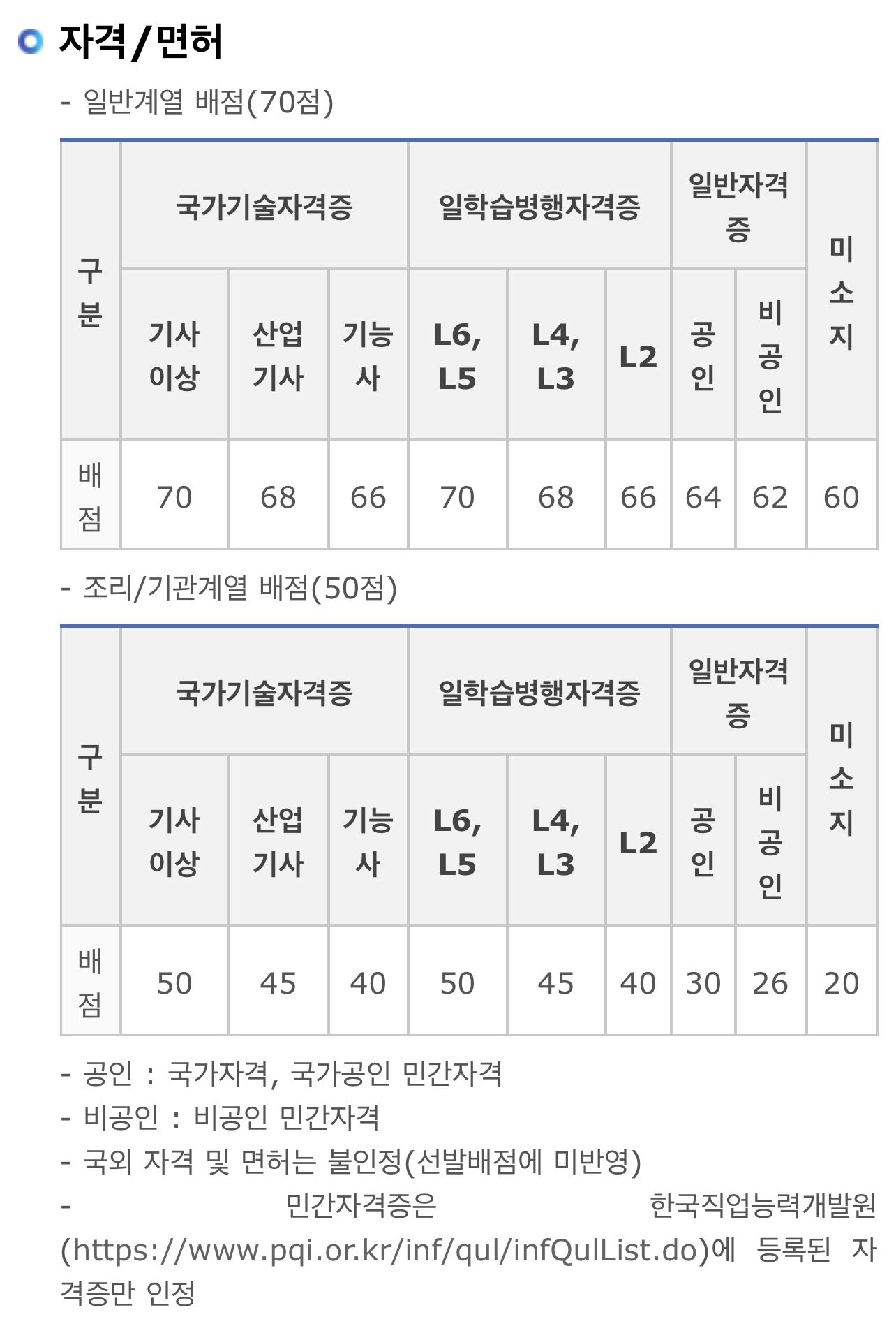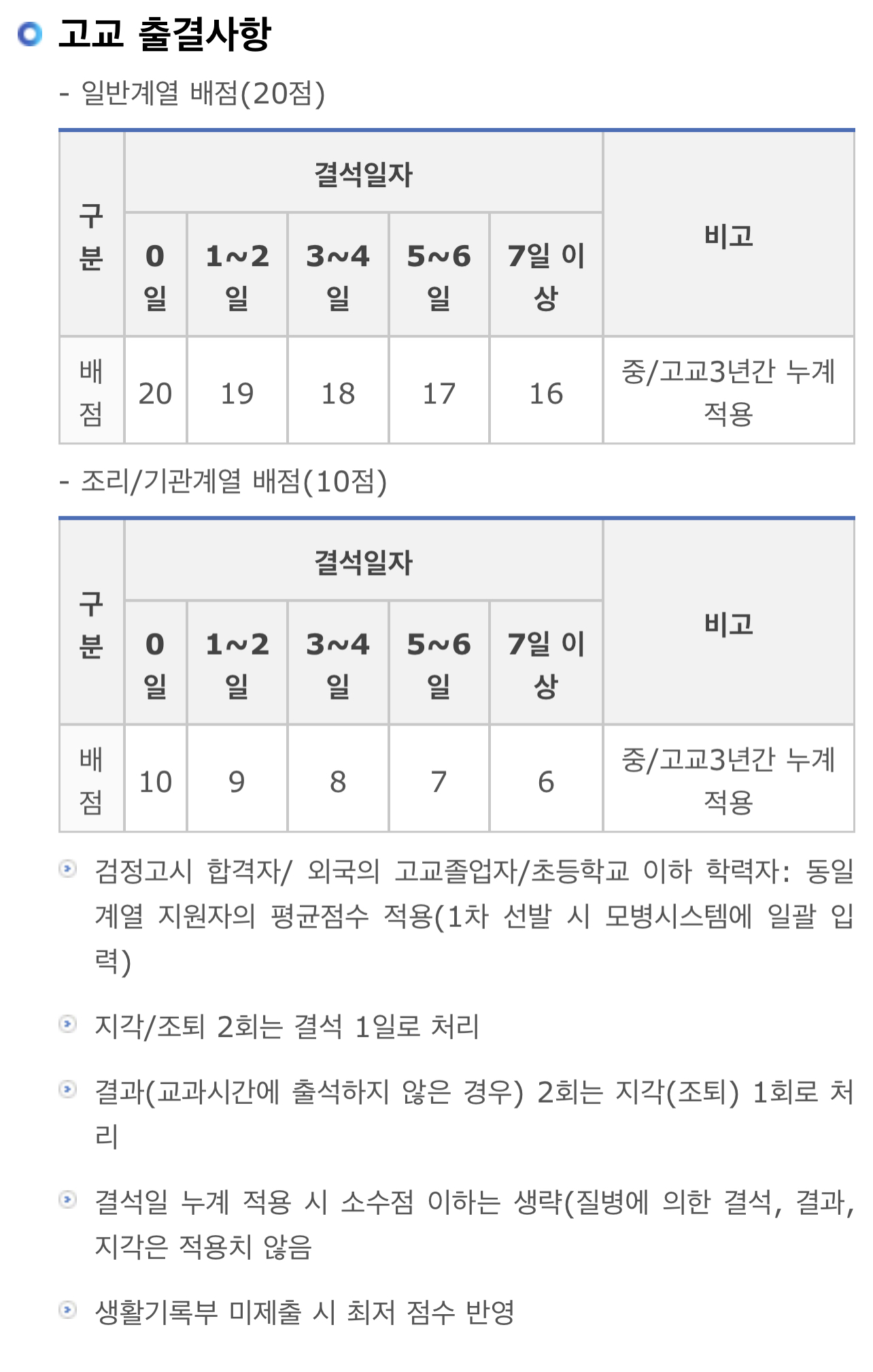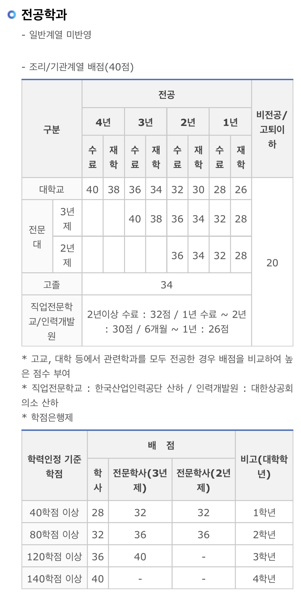 ➡️조리/기관계열: 자격·면허 50점, 전공 40점, 출결사항 10점, 면접 100점, 가산점 15점