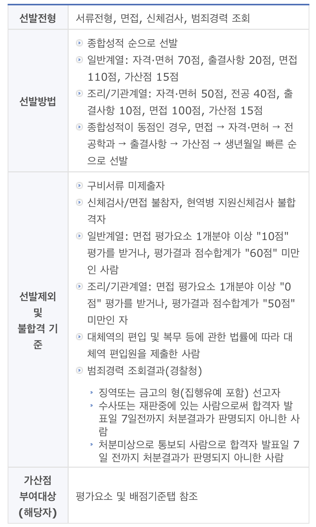 선발제외 및 불합격 기준
