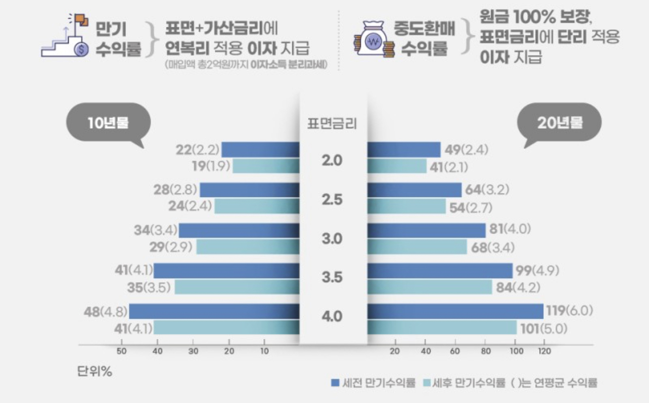 * 금리 3.5% 가정할 경우 만기 보유 시 연복리 효과로 연평균 수 익률(세전) 10년물 4.1%, 20년물 4.9%