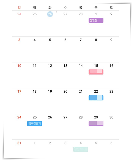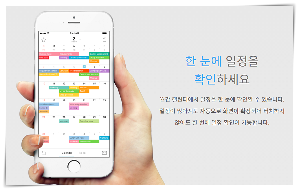 1. 월간 캘린더에서 일정을 한눈으로 확인할 수 있습니다. 일정이 많아도 자동으로 화면이 확장되어있기 때문에, 터치를 할 필요 없이 모든 일정을 한번에 검색할 수 있다는 것입니다.