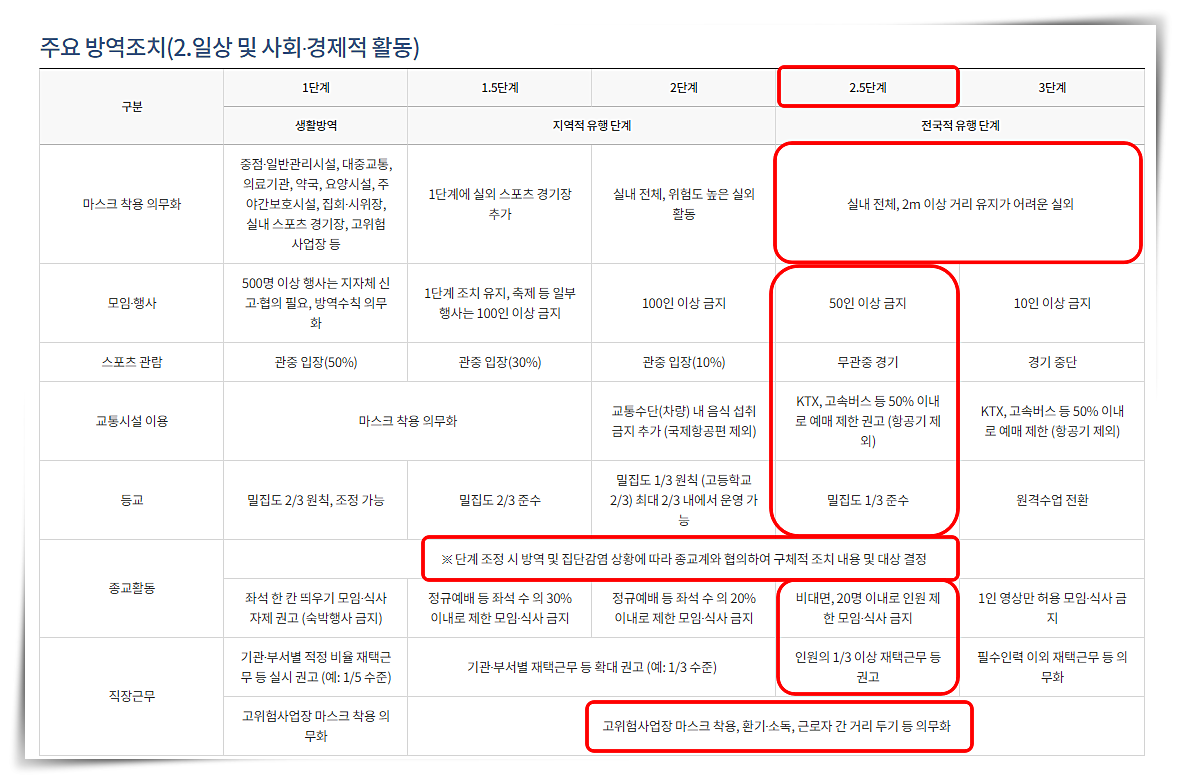 서울 코로나 사회적 거리두기 2.5단계 : 일상 및 사회 경제적 활동