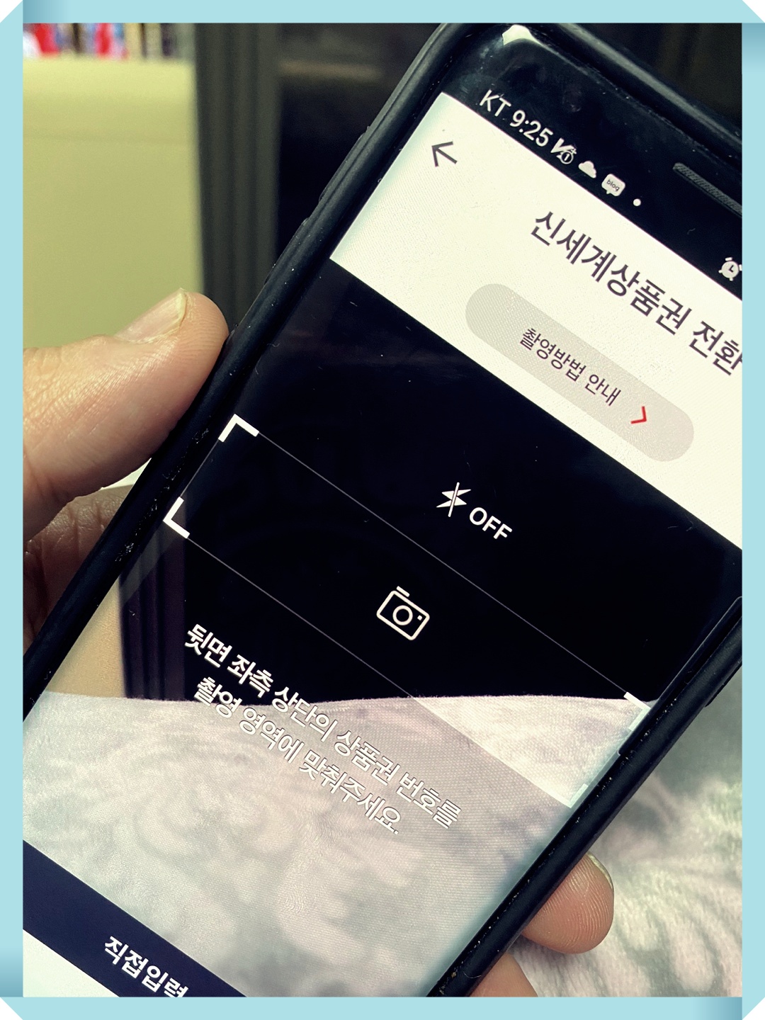 4. 신세계상품권을 누르면 상품권 번호를 촬영하면 충전이 완료됩니다.