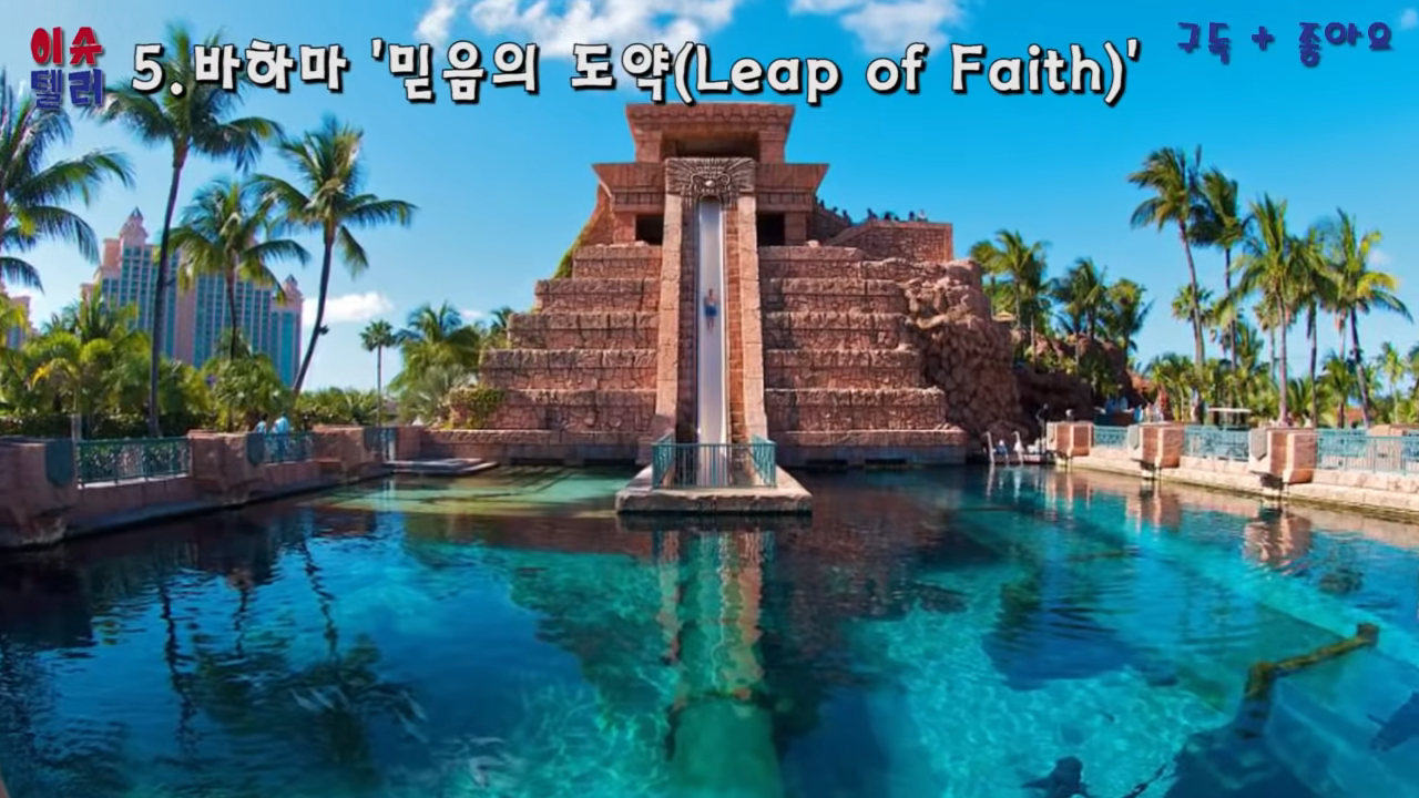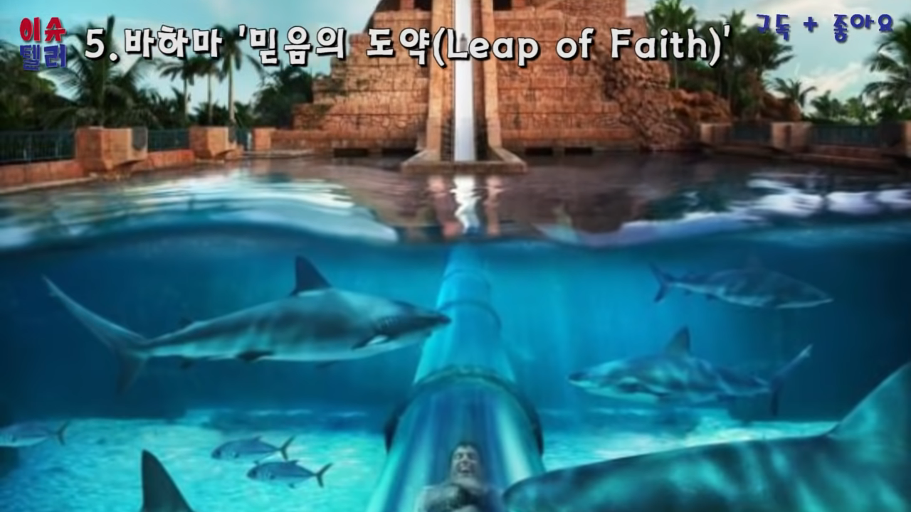 바하마 파라다이스 아일랜드에 있는 아틀란티스 리조트의 리듬의 도약은 마야 사원을 닮은 18m짜리 건물에서 시속 56km로 쏜살같이 내려옵니다. 다른 워터 슬라이드에 비해서 높이나 속도가 그렇게 대단하지 않다고 생각할 수도 있지만 포인트는 바로 쏜살같이 내려오다 보면 유리 터널 밖으로 신나게 헤엄치는 상어들 사이를 뚫고 지나간다는 것이죠. 상상만 해도 아찔하네요.