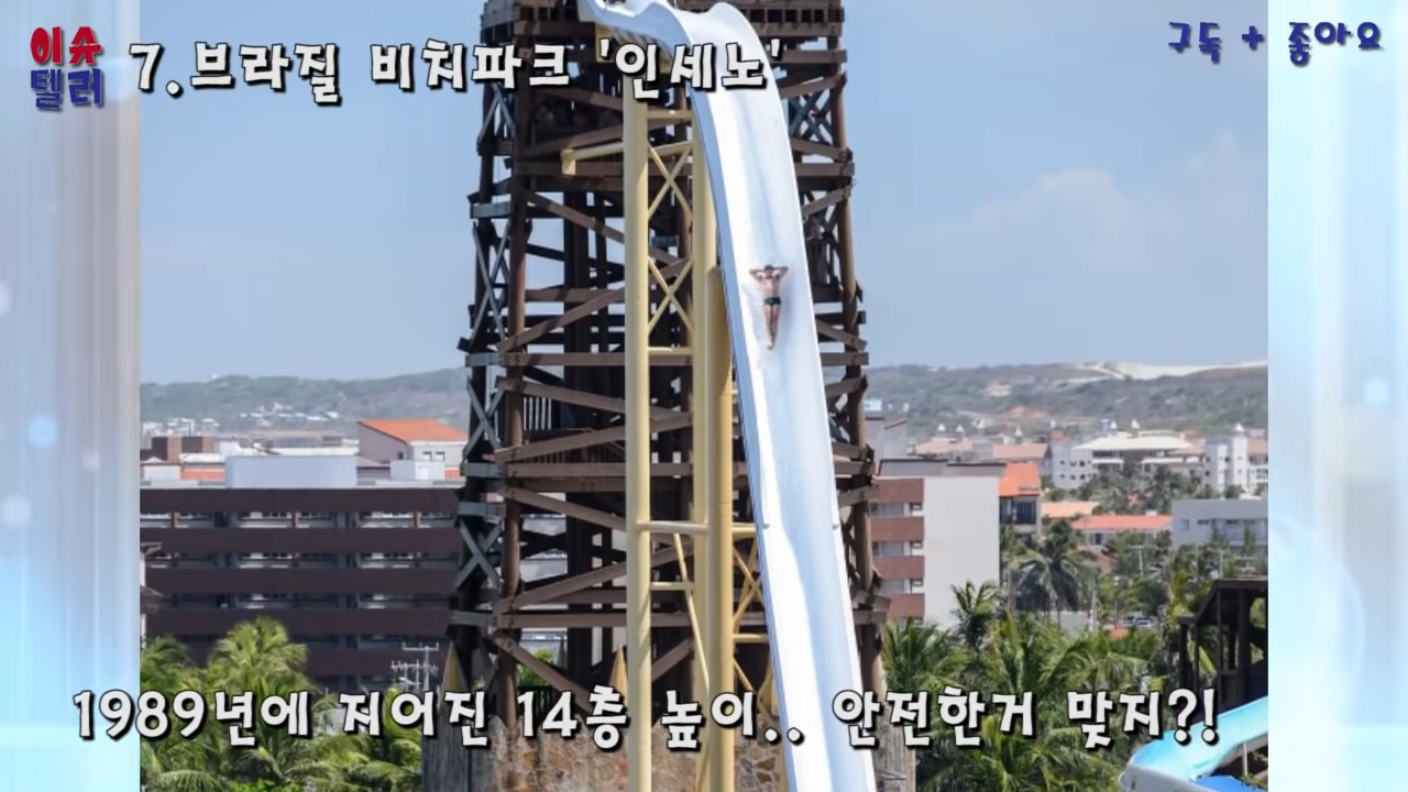 자그마치 1989년에 지어진 브라질의 미끄럼틀은 41m 약 14층 높이에서 시속 105km의 속도를 맨몸으로 느끼며 떨어집니다.