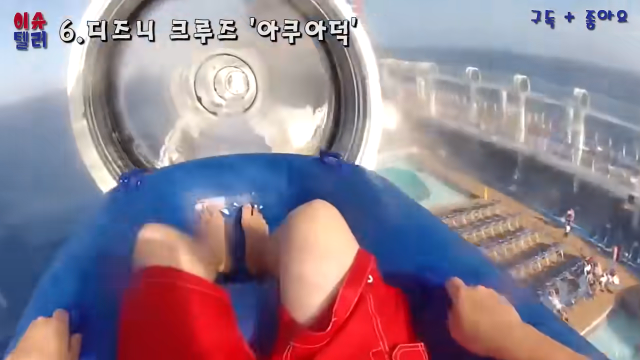 어린이들의 꿈의 여행 중 하나인 디즈니 크루즈에 있는 아쿠아 덕입니다. 2011년 디즈니의 세 번째 크루즈인 디즈니 드림의 크루즈 역사 최초로 배 위에서 워터 슬라이드를 즐길 수 있는 상상력을 발휘했죠.