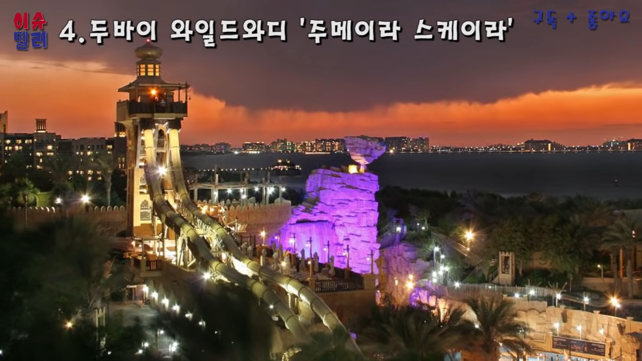 두바이에 위치한 와일드 와디의 유명한 워터 슬라이드 주메이라 스케이라입니다. 32m 높이에서 시속 80km의 속도로 120m를 순식간에 내려오는데요.