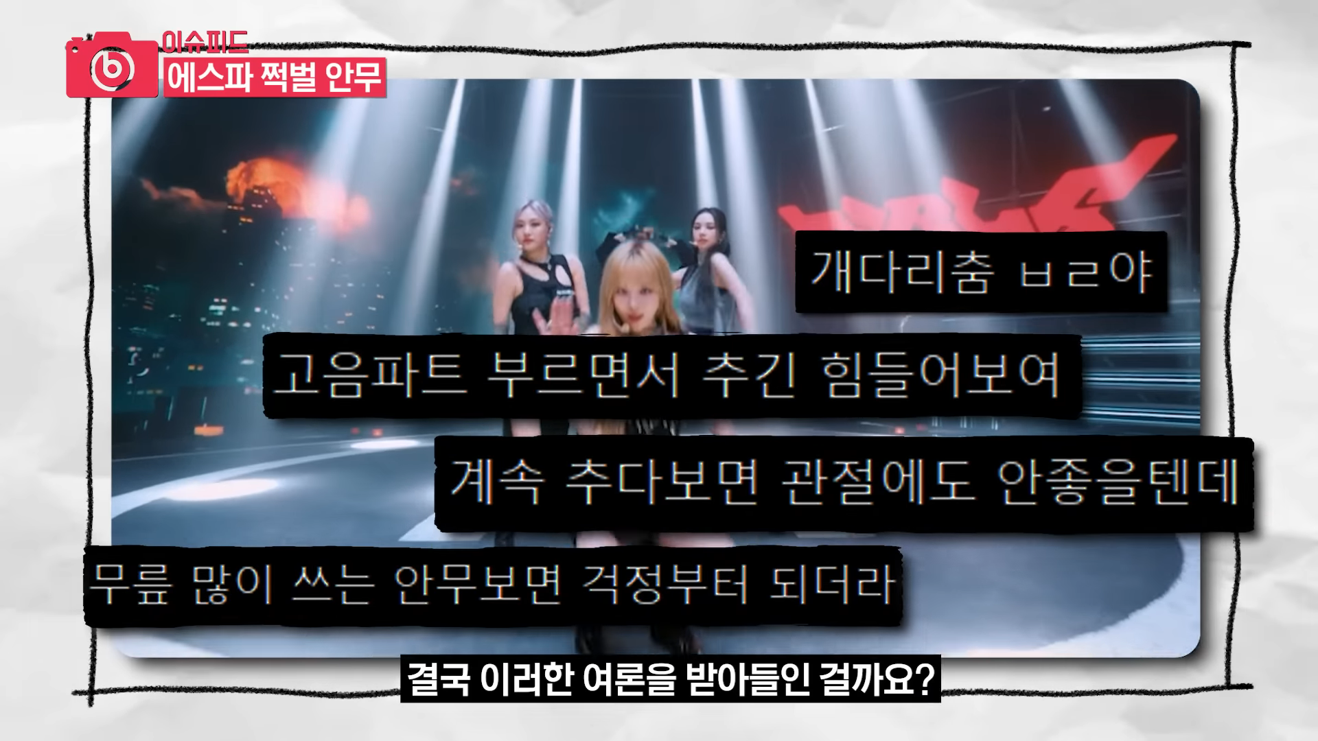 비교적 색다른 안무로 호으로는 갈렸지만 그래도 에스파만의 색깔이 느껴졌던 걸스 하지만 곡의 막바지에 나오는 윈터의 안무는 불호가 지배적이었습니다.