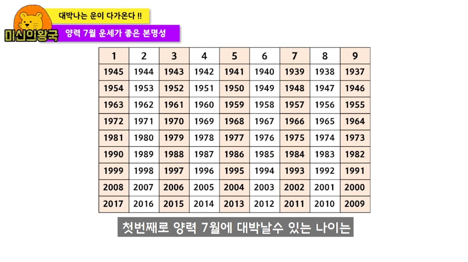 하단에 보이는 본명성은 1945년부터 2009년도까지 1번부터 9번까지 나누어져서 그 달에 맞게끔 행운이 예측할 수 있습니다.