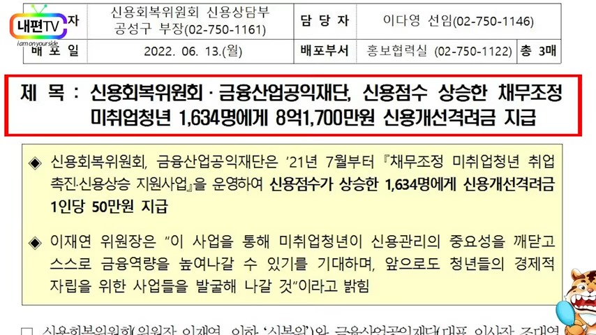 신용회복위원회, 금융산업공익재단, 신용점수 상승한 채무조정 미취업청년에게 지급하는 신용개선격려지금입니다.