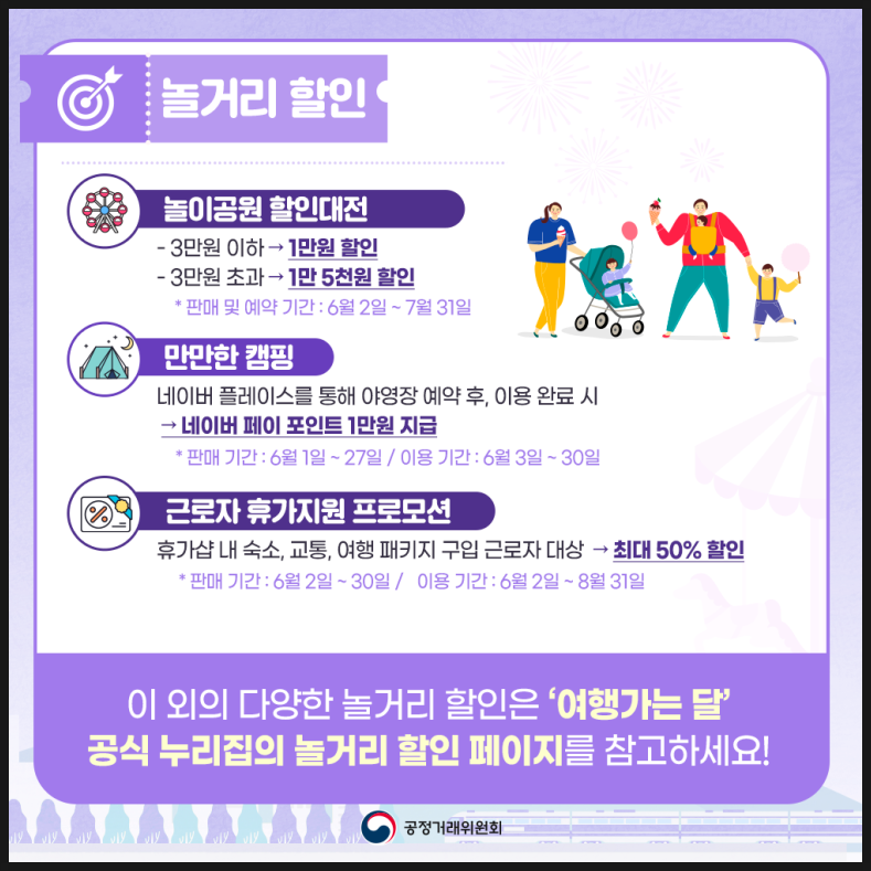 놀이공원 할인대전, 만만한 캠핑, 근로자 휴가지원 프로모션을 통해서 최대 50%까지 할인 받을 수 있습니다.하단에 보이는 내용을 확인하고 신청해야 합니다.