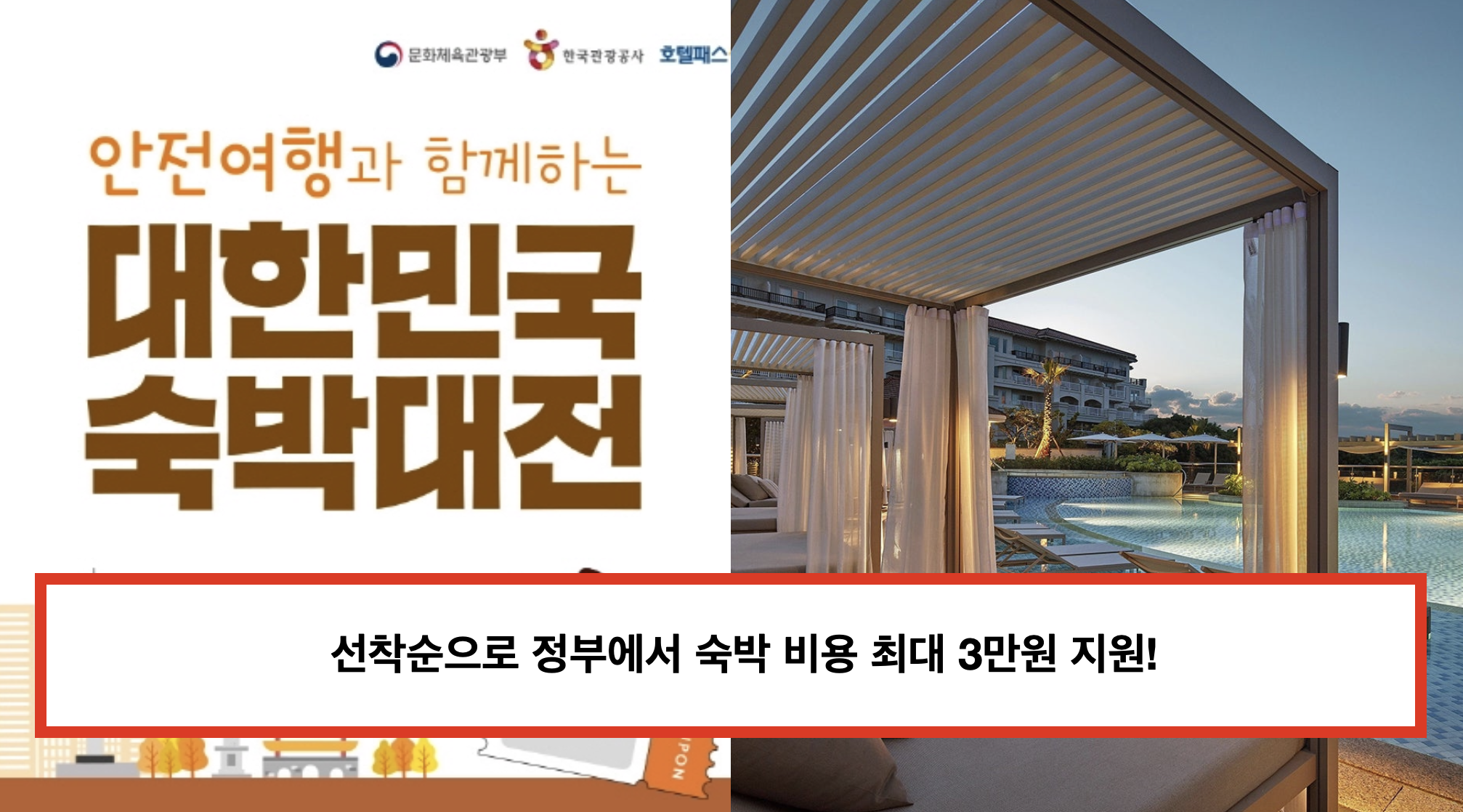 정부에서 전 국민을 상대로 전국 숙박업체에서 사용할 수 있는 숙박 할인권을 지급할 예정입니다. 선착순으로 지급되며 본인의 소득 관계 없이 신청 가능하다는 점입니다. 1인 1회 발급이 가능하고 소진되면 더 이상 발급되지 않습니다.