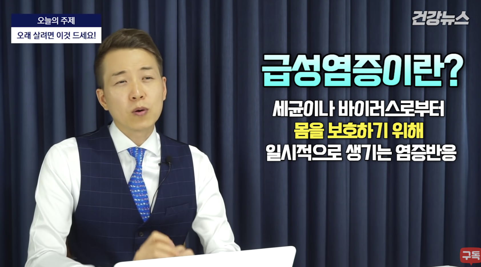 급성염증은 착한 염증이라고 불리는 이 염증은 생체조직에 손상을 입었을 때, 세균이나 바이러스로부터 몸을 보호하기 위해서 일시적으로 생기는 염증이라고 알려져 있습니다. 해당 증상은 2~3주 내외로 호전되는 경우가 많습니다.
