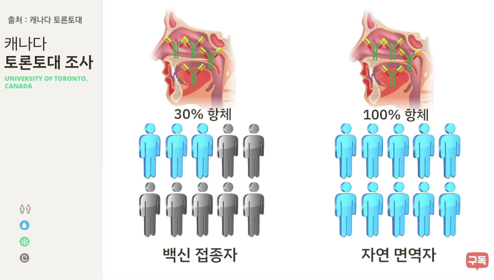캐나다 토론토대 조사에서 백신접종자 및 오미크론 확진자에 대한 코와 입 내에 항체가 생길 확률이 30%와 100% 차이를 보이면서 면역력에 대한 강한 모습을 보여줍니다.