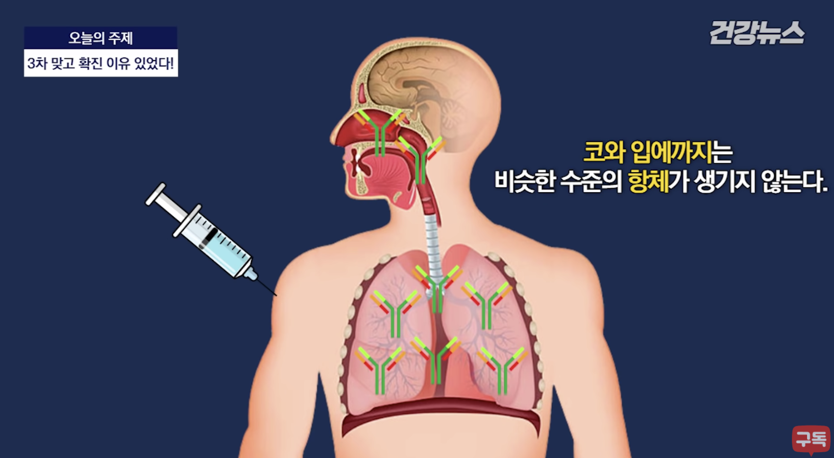 보통 우리는 백신을 맞을 때 팔에 맞게 됩니다. 팔에 맞은 백신은 팔 근육 속 혈액을 타고 항체들이 온 몸에 퍼지게 됩니다. 팔 주변에는 백신을 대항하는 항체는 생깁니다. 그러나 코와 입 속에는 팔에 맞은 면역력처럼 강하게 나타나지 않는다는 것입니다.