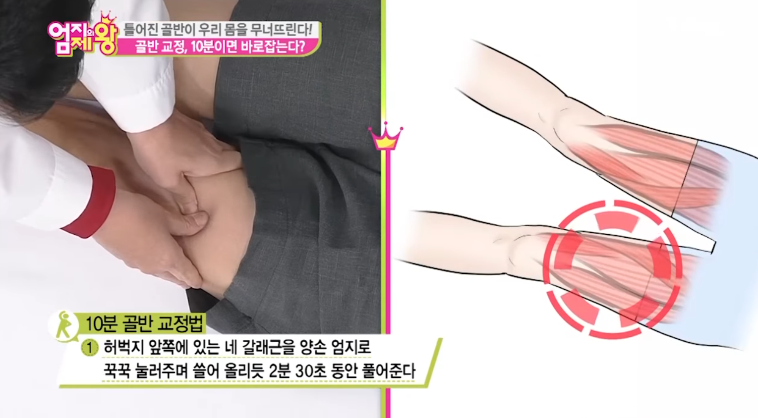 허벅지 뒤쪽에서 골반을 잡아당기는 근육과 햄스트링 분위를 양손 엄지로 눌러주면서 쓸어내리듯 2분 30초 동안 풀어줍니다.