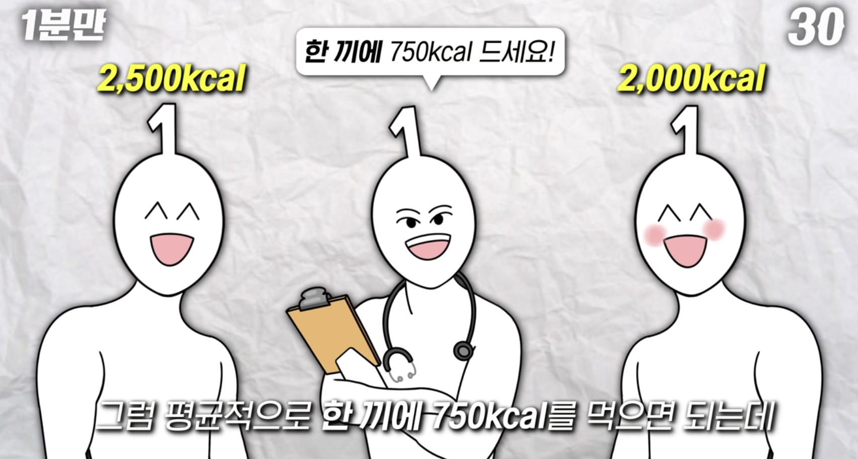영양분 기준으로 알아보면 그 해답을 바로 확인할 수 있습니다. 성인 남성은 1일 기준 2,500kcal, 성인 여성은 2,000kcal가 권장 섭취량입니다. 그러다보니 1일 1끼 기준으로는 750cal 전후가 된다는 것을 확인할 수 있습니다.