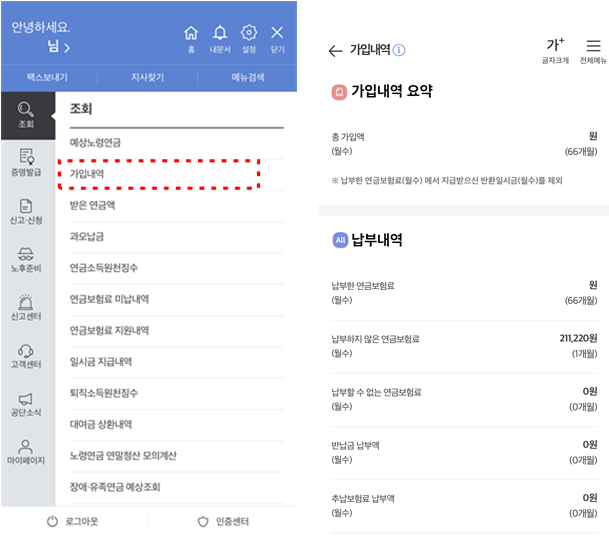 공인인증서나 네이버, 카카오페이 인증 서비스로 로그인을 한 후 [(오른쪽 상단) 전체 메뉴-가입내역]을 선택하면 총 납부 내역과 미납한 보험료 등을 상세하게 확인할 수 있습니다.