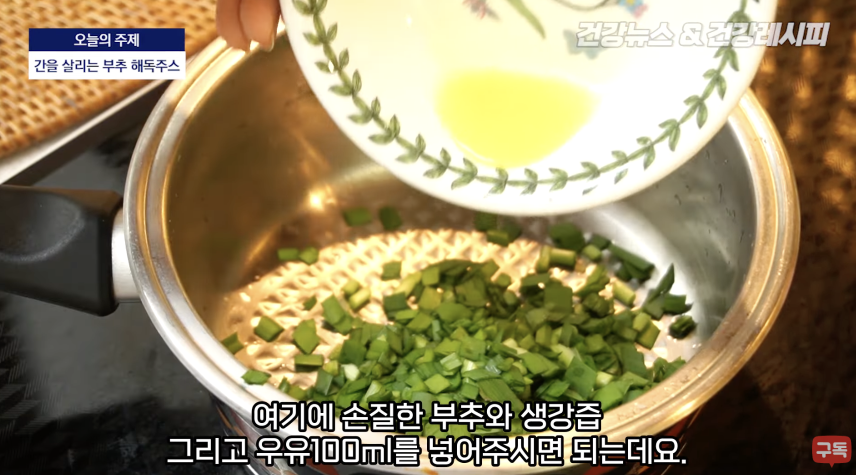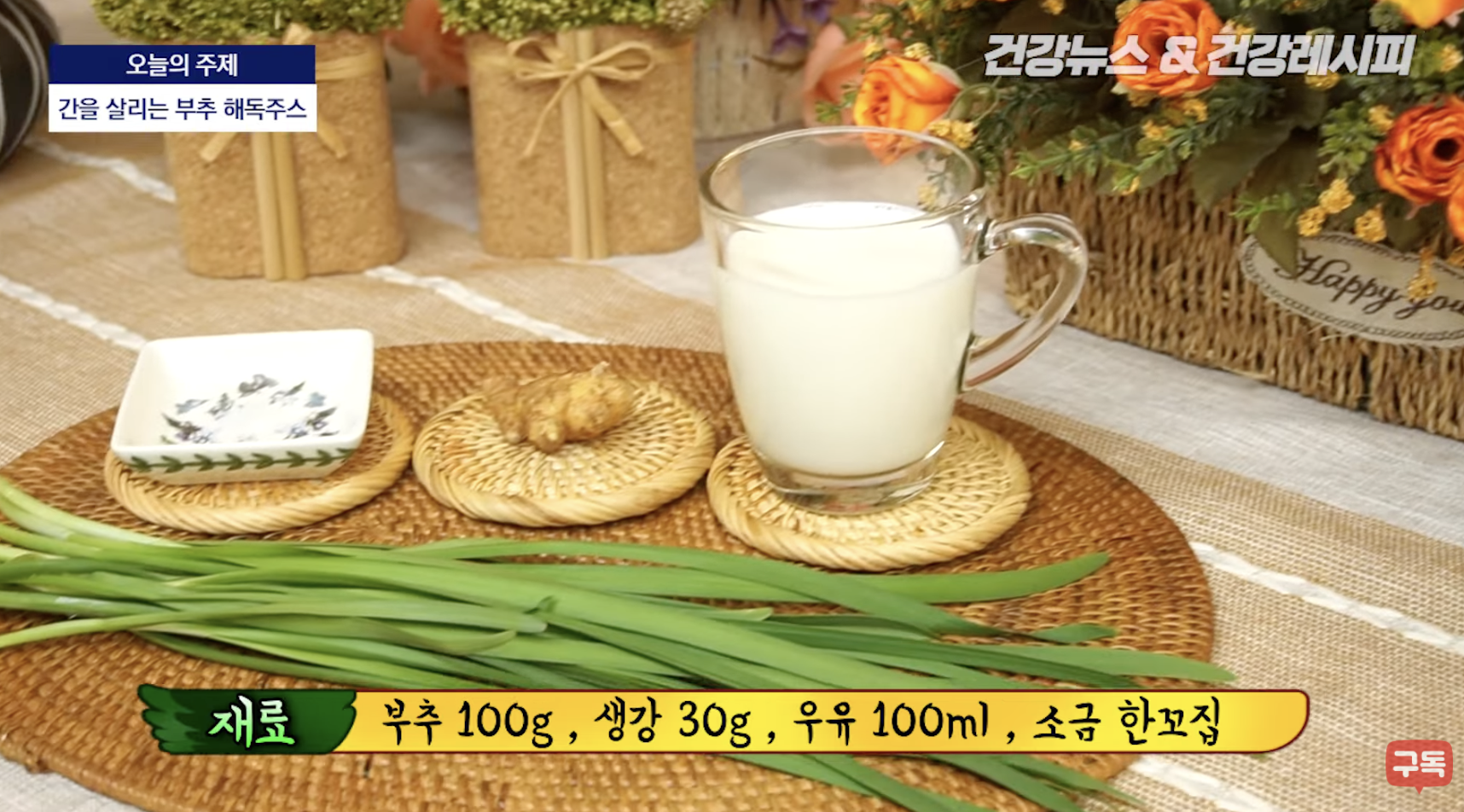 재료 : 부추 100g, 생강 30g, 우유 100ml, 소금 한꼬집