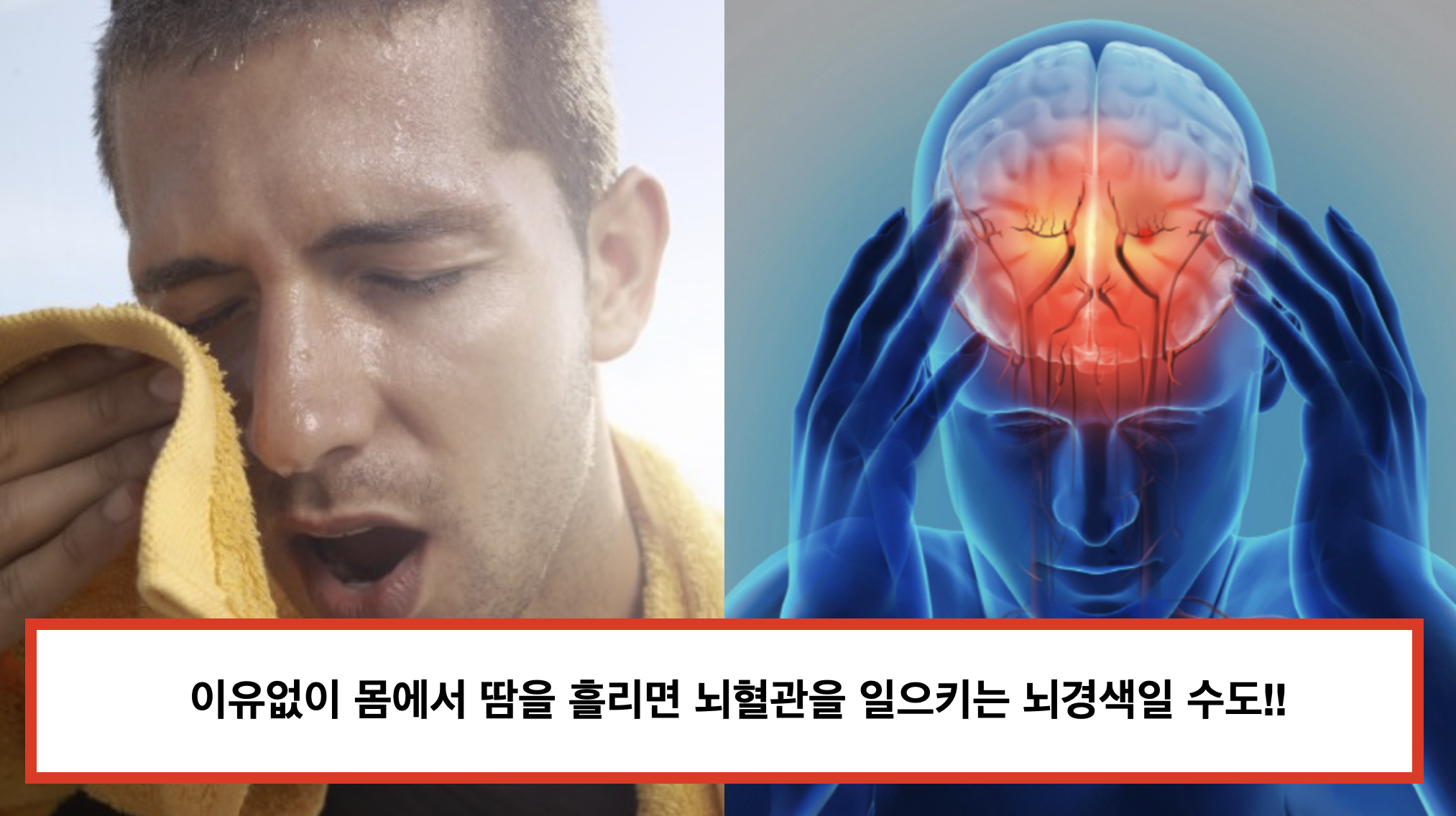 운동을 하거나 일을 하다가 땀이 흐르는데 유독히 한쪽으로만 땀이 발생하는 경우가 있습니다. 땀은 특정 부위에 상관없이 골고루 나오는 것이 당연해야 합니다. 한쪽에서만 땀이 발생한다면 뇌혈관이 막힌 뇌경색일 가능성이 있습니다.