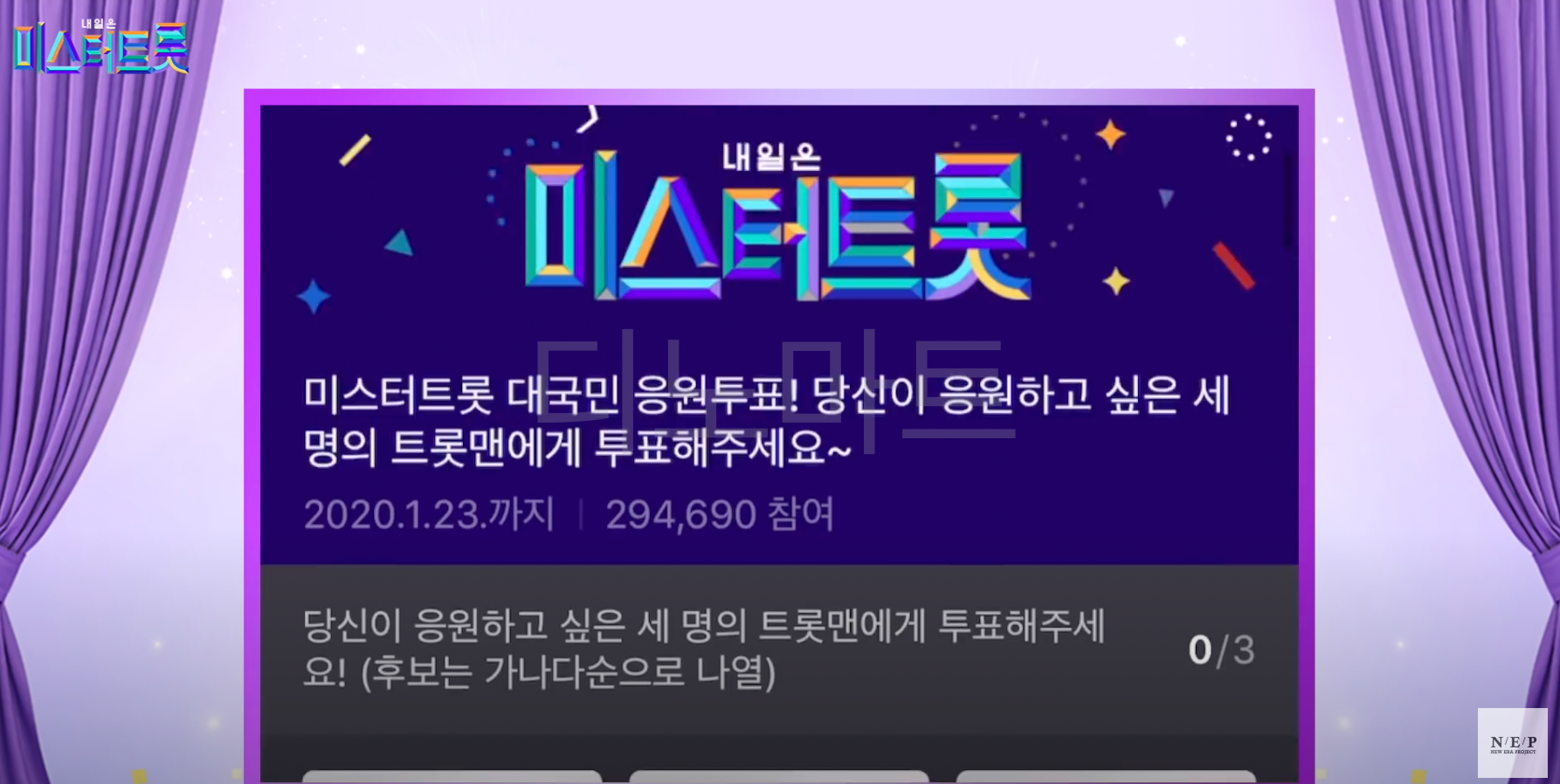 4. 3명의 트롯맨을 선택하면 마지막 하단에 있는 배너를 선택하여 투표하기 완료합니다.