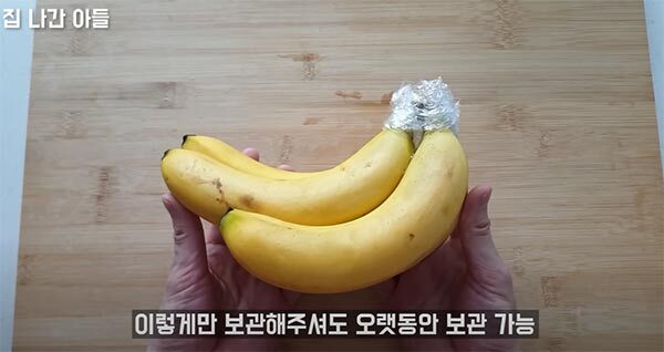 4. 검게 변한 바나나의 꼭지를 잘라주고 랩 또는 호일로 감싸면 됩니다.