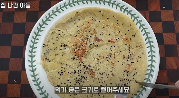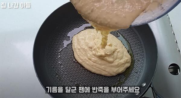 3. 기름을 달군 팬에 반죽을 부어서 팬케이크 처럼 만듭니다.