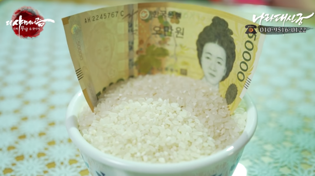 위의 사진과 같이 깨끗한 쌀을 밥그릇에 담아줍니다. 그리고 본인이 가지고 있는 지폐를 사용합니다. 여기서 지폐를 5만원, 1만원, 1천원 등 다양한 지페가 있는데, 굳이 큰 금액을 할 필요 없이 본인이 가지고 있는 지폐를 이용하면 됩니다.