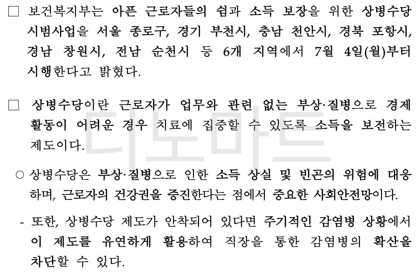 근로자가 업무와 관련없는 부상 또는 질병으로 경제 활동이 어려운 경우, 치료에 집중할 수 있도록 소득을 보전하는 제도입니다. 부상 또는 질병으로 인한 소득 상실 및 빈곤에 대한 위험을 대응하며 근로자의 건강권을 증진하는 것으 주 목적입니다.