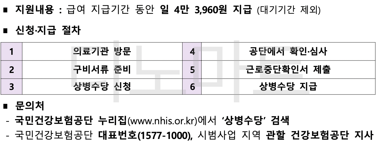 국민건강보험공단 누리집에 방문하여 상병수당을 검색하면 자세한 내용을 확인할 수 있습니다.