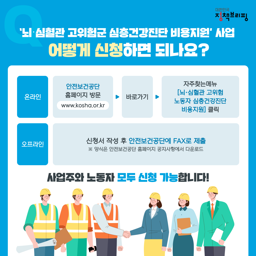 - 온라인: 안전보건공단 홈페이지(https://www.kosha.or.kr/kosha/index.do) 방문 → 바로가기 → 자주찾는메뉴 「뇌·심혈관 고위험 노동자 심층건강진단 비용지원」 클릭