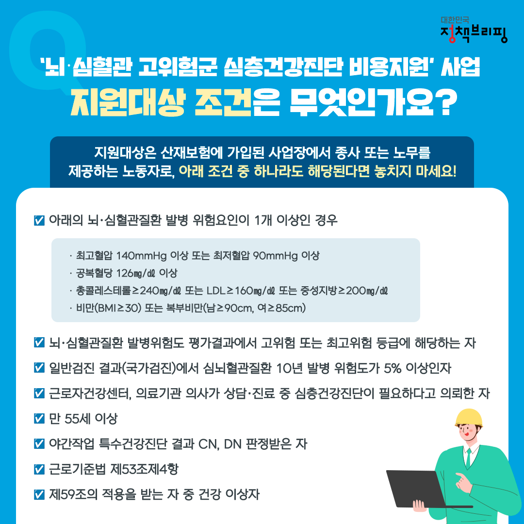 심층건강진단 지원 대상자 및 비용 지원받는 법에 대해서 알아보겠습니다. 장시간 고된 노동, 스트레스 등으로 인해 발생할 수 있는 뇌·심혈관질환! 경비원이나 택시·버스 운전기사, 택배기사처럼 야간작업이나 장시간 근무, 고령 등으로 뇌·심혈관질환에 취약한 노동자들에게 정부가 심층건강진단 비용의 80%를 지원한다고 합니다.