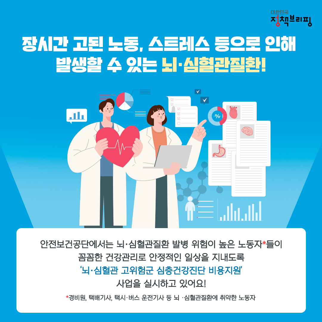 안전보건공단에서 뇌·심혈관질환 발병 위험이 높은 노동자들이 꼼꼼한 건강관리로 안정적인 일상을 지낼 수 있도록 지원하고 있는 사업입니다.