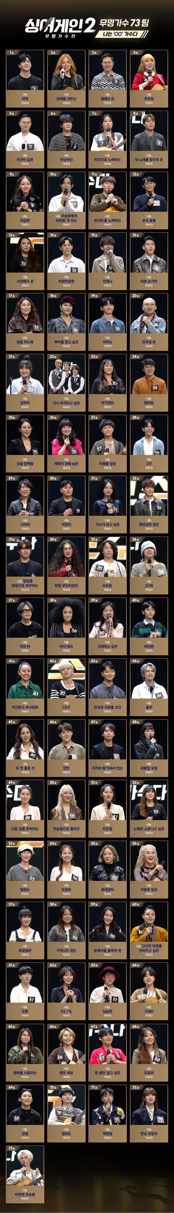 무명가수 참가자는 73명으로 구성되어 있습니다. 예능 프로그램 내에서는 본인의 이름을 절대 언급하며 안되며, 숫자로만 불리게 됩니다. 그러나 네티즌들은 얼굴과 목소리를 통해서 대부분의 무명가수가 누구인지 확인할 수 있었습니다.