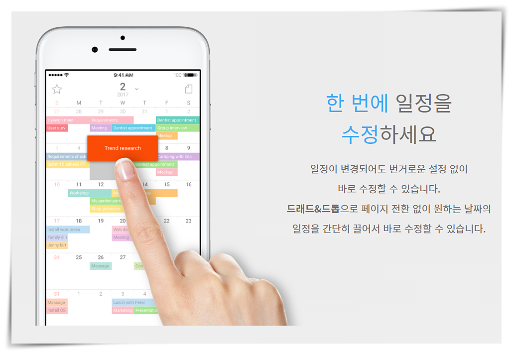 3. 일정이 변경되더라도 바로 수정 가능하며, 드래그&드롭으로 페이지 변환없이 원하는 날짜의 일정을 바로 수정할 수 있습니다.