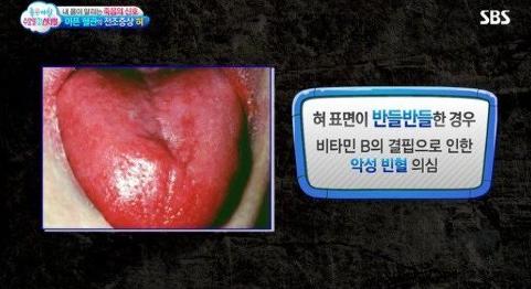 2. 혀 표면이 반들반들한 경우 비타민B의 결핍으로 악성 빈혈이 의심될 수 있습니다.