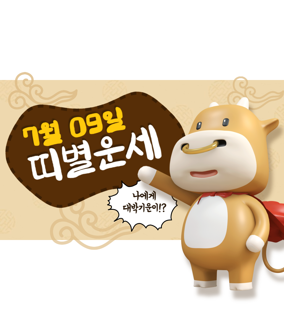 애정 운이 최상이군요. 그 동안 아슬아슬 상대의 마음을 사로 잡기가 무척 힘들었죠? 나의 매력이 한 층 돋보이는 날 이니, 좋아하는 사람이 있다면 적극적으로 다가가 보세요.