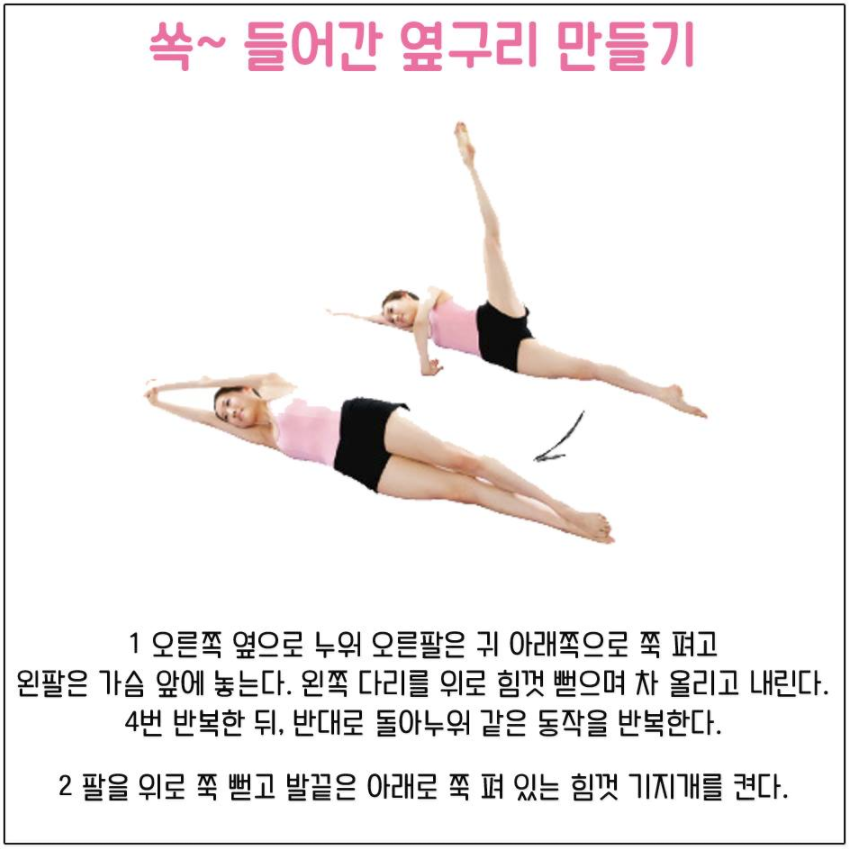 오른쪽 옆으로 누워서 오른팔을 귀 아래쪽으로 쭉 펴고 왼팔은 가슴 앞에 놓습니다. 왼쪽 다리를 위로 뻗으며 차 올리고 내립니다. 4번을 반복하고 반대로 돌아누워서 동일 동작을 반복합니다. 팔을 위로 쭉 뻗고 발끝은 아래로 쭉 펼 수 있도록 기지개를 켭니다.