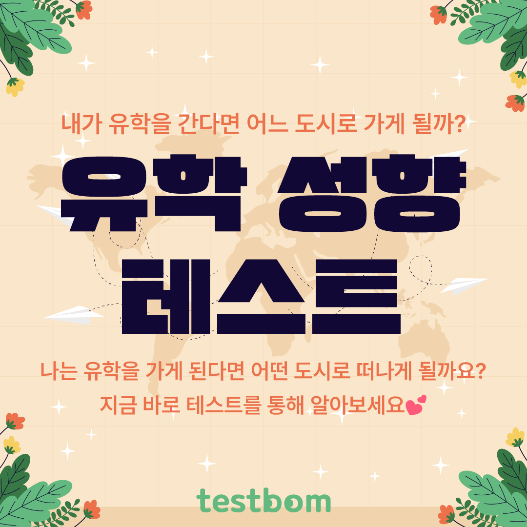유학 성향 테스트 | mbti 유형 전체 결과 포함에 대해서 정리하겠습니다. 교환학생, 어학연수, 진로 계획 등 다양한 이유로 떠나게 되는 유학! 나는 유학을 가게 된다면 어떤 도시로 떠나게 될지 알아볼 수 있는 테스트봄에서 나온 ‘유학 성향 테스트’를 소개드리겠습니다.
